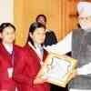 (PTI/Atul Yadav) Prime Minister Manmohan Singh gives away an award to Sunita during the 'Bravery Awards' ceremony in New Delhi on January 22, 2011.