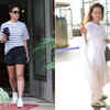 Kareena aces her casual-yet-stylish look in a striped t-shirt, black shorts and white sneakers.