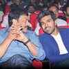 Ram Charan Teja interacts with his father Chiranjeevi during the audio release function of Telugu movie Yevadu, held at Shilpakala Vedika auditorium recently. (BCCL/T Mallikarjun)