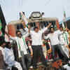 Praja Rajyam Party president K Chiranjeevi with actors Ram Charan Teja and Allu Arjun during the launch of the praja rail yatra in Hyderabad. (BCCL)