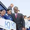 Civil Aviation minister, Praful Patel with the staffs of IndiGo airlines, after the handing over ceremony of 'Airbus A320' aircraft at the air show 'India Aviation 2010' on March 03, 2010.