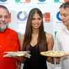 MD & CEO Blue Foods, Sunil Kapur (R) and Italian chef Bill Marchetti (L) poses with a model with dishes in centre at the launch of the Italian restaurant 'Spaghetti kitchen' - Photogallery