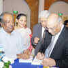 The Principal Secretary to the Energy Dept.K. Jairaj watches as Prof. C.K.Prahlad autographs a copy of his book in Bangalore. (Photo/Vinesh Vasanth Betrabet)  (BCCL)