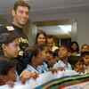 Virdhawal pose with the school children at the book release function in Bangalore. (Photo/Sayed Asif)