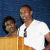 Cricketer Dwayne Bravo addresses audience as PRO Nikhil Murugan looks on during the press meet of Tamil movie Ula, held at Prasad Labs in Chennai.