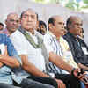 (L-R) Vijay, Vijayakumar, Vagai Chandrasekar, Rajinikanth and Sarath Kumar stage a one-day fast to demand scrapping of the service tax levied by the Centre on artists. (BCCL/B A Raju) /events/chennai/k-town-stars-on-fast/eventshow/17953650.cms04