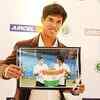 Tennis player Somdev Devvarman poses with a photograph during his felicitation, organised by Tamil Nadu Tennis Association, in Chennai on Thursday