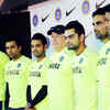 Cricketers pose for cameras during a press meet to announce the new training jersey of Team India in Chennai. (BCCL/B A Raju)