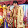 Preethi and Vikram Sagar pose onstage during their wedding reception party, held in Chennai. (BCCL/Praveen Tyagarajan)