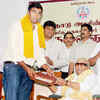 Indian cricketers MS Dhoni, Suresh Raina and R Ashwin at a felicitation function in Chennai. (PTI/R Senthil Kumar)