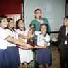 Derek O'Brien poses with the winners of the 'Bournvita Quiz Contest', the girls from Birla High school while presenting them with trophy at Calcutta Boys school - Photogallery