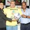 Branco holds a soccer ball at a press meet at a city hotel. (BCCL/Krishna Roy)