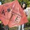 A guest poses with a kite, having the logo of TOI on it during the Times Kite Festival. (Photo/Subrata Kotal) (BCCL)