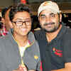 Akshat Srivastava (L) and RJ Gaurav during the launch of Peter England showroom at Durgakund in Varanasi.