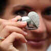 A model presents a heart shaped one gigabyte memory stick decorated with imitated diamonds made by Philips in Berlin, Germany. (AP )
