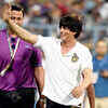 KKR owner Bollywood actor Shah Rukh Khan with his son during IPL 2015 first match against Mumbai Indians at Eden Garden in Kolkata on Wednesday. (PTI)