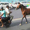 A pillion rider pulls the horse near Rajghat in Delhi. (BCCL)