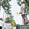 People pay floral tribute to the statue of music maestro late Bhupen Hazarika on his 89 birth anniversary, at Prasanti Udyan, in Guwahati. (PTI)
