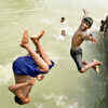 Children jump into the Ganga river to beat the heat on a hot day in Murshidabad district, West Bengal. (PTI)