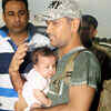 Indian Cricket team skipper Mahendra Singh Dhoni with her daughter 'Ziva' at Birsa Munda International Airport in Ranchi. (PTI)