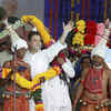 Congress Vice President Rahul Gandhi is garlanded during a public meeting at Dedia Pada tribal belt in Narmada district of Gujarat. (PTI)