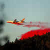 A helicopter drops water as a wildfire called the Getty fire burns on Kenter Canyon in Los Angeles, Monday, Oct. 28, 2019.