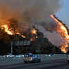 Hand crews work on a hillside as the Getty fire burns on Kenter Canyon in Los Angeles, Monday, Oct. 28, 2019.