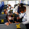 Employees of an assembly factory receive a dose of the Pfizer-BioNTech coronavirus disease (COVID-19) vaccine aboard a bus in Ciudad Juarez, Mexico.