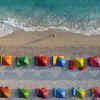 An aerial view shows a person walking near parasols on a beach of the Ionian Sea in Dhermi, Albania on June 20, 2021.