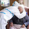 Nicky Clough visits her mother Pam Harrison in her bedroom at Alexander House Care Home for the first time since the coronavirus disease (COVID-19) lockdown restrictions begin to ease, in London.