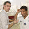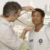 Sachin cheers up showing artificial eyeballs matching with his own eyes while being measured for his wax statue. (PTI)