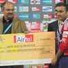 Delhi Daredevils batsman V Sehwag reciving cheque for 'Man of the Match' during a Champions League T20 match at the Ferozshah Kotla Stadium in New Delhi on October 11, 2009. (PTI/Manvender Vashist)