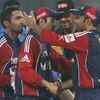 Delhi Daredevils batsman V Sehwag with teammates greets each other as they win over Wayamba during a Champions League T20 match at the Ferozshah Kotla Stadium in New Delhi on October 11, 2009. (PTI/Manvender Vashist)