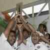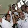 Indian cricket Captain Mahendra Dhoni, left, cheers along with teammates as they display the Twenty20 World Cup trophy at their arrival at the Mumbai airport on Wednesday, September 26, 2007. Ecstatic fans danced and showered rose petals on India's victorious cricket team on its returned home Wednesday after winning the inaugural Twenty20 World Cup in South Africa. (AP Photo/Rajesh Nirgude)