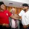 Harbhajan Singh interacts with media as S Sreesanth looks on, after he was banned from playing in the IPL. (Toi Photo) (BCCL)