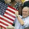 U.S. President George W. Bush holds up the U.S. flag during the swimming competition in the National Aquatics Center at the Beijing 2008 Olympic Games on August 10, 2008. (Reuters/Jerry Lampen)