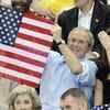 U.S. President George W. Bush, accompanied by his wife Laura (L) and their daughter Barbara (R) raises a U.S. flag upon arriving at the swimming competitions in the National Aquatics Center at the Beijing 2008 Olympics in Beijing on August 10, 2008. (AP Photo/Thomas Kienzle)