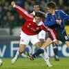 Rapids Martin Hiden and Juventus' Zhatan Ibrahimovic (from left) challenge for the ball during their Champions League group A soccer match Rapid Vienna vs Juventus at Vienna's Ernst Happel stadium, on Wednesday, December 7, 2005 - Photogallery