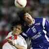 River Plate's striker Radamel Falcao Garcia of Colombia (top) heads the ball over Defensor Sporting's Sebastian Airosa during their Copa Sudamericana second leg quarter-final soccer match in Buenos Aires (Reuters/Marcos Brindicci)
