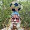 Soccer fan Ramesh Chandra Kushwaha sports a headgear with a football