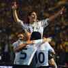 Argentine Lionel Messi (top) celebrates with teammates after the first goal against Colombia during their FIFA World Cup South Africa-2010 qualifier football match - Photogallery
