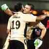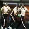Adam Gilchrist and V V S Laxman of Deccan Chargers celebrate their victory over Mumbai Indians, at the D Y Patil Sports Stadium. (PTI Photo/Shirish Shete)