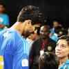 'Man of the Match' Ashish Nehra being greeted by an Ambani family member after the IPL T20 match at the DY Patil Sports Stadium at Nerul, Mumbai on May 7, 2008. Mumbai Indians won by 7 wickets (with 29 balls remaining). (PTI Photo/Shirish Shete)