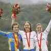 Britain's Nicole Cooke (C) shows her gold medal of the Women's Road Cycling Race, flanked by Tatiana Guderzo, of Italy (R) who clinched the silver, and Sweden's Emma Johansson, bronze, at the Beijing 2008 Olympics in Beijing on August 10, 2008 - Photogallery