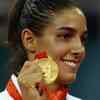 Gold medalist Giulia Quintavalle,of Italy, stands with her medal after the judo lightweight division finals at the Beijing 2008 Olympics in Beijing on August 11, 2008. (AP Photo/Charles Dharapak)