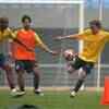 Brazil's Olympic soccer team player Lucas (R) takes part in a training session of his team in Shenyang on Monday, August 4, 2008. Brazil will start their 2008 Beijing Olympic Games campaign against Belgium on Aug 7. (AFP Photo)
