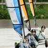 Phil Ready (R) struggles to control his cart in the light weights performance division during racing in the World Blokart Championships in Papamoa, near Tauranga, New Zealand. (AP Photo/Alan Gibson)