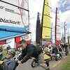 Competitors get a push-start to get them going for the start of racing in the World Blokart Championship in Papamoa, near Tauranga, New Zealand. (AP Photo/Alan Gibson)