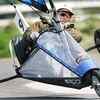 Stuart Cooney gets up on two wheels during racing in the World Blokart Championship in Papamoa near Tauranga, New Zealand. (AP Photo/Alan Gibson)