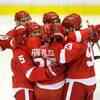 Brian Rafalski of the Detroit Red Wings celebrates with teammates after he scored a third period goal against the Pittsburgh Penguins during game five of the 2008 NHL Stanley Cup Finals at Joe Louis Arena on June 2, 2008 in Detroit, Michigan - Photogallery